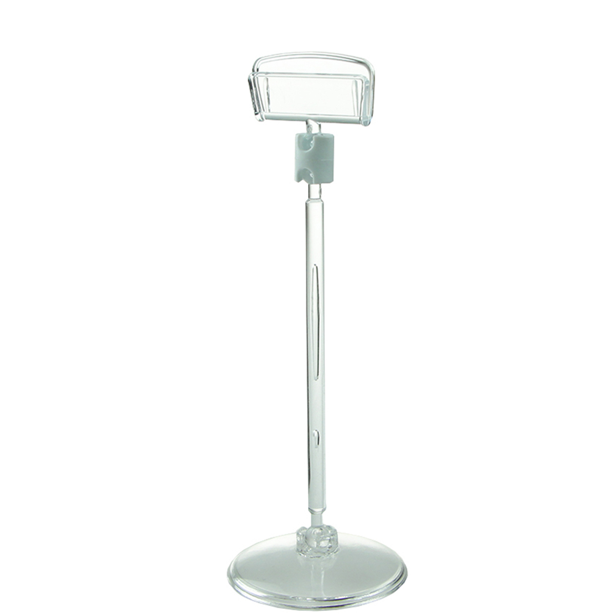 Ценникодержатель на прозрачной пластиковой подставке. Шарнирное соединение позволяет регулировать угол наклона. Три варианта длины ножки - 0, 50, 100 мм.