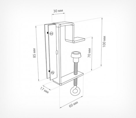 Позволяет закреплять сегментационные разделители толщиной до 6 мм перпендикулярно торцу полки. Вывеска зажимается в струбцине 2-мя потайными прижимными винтами.
