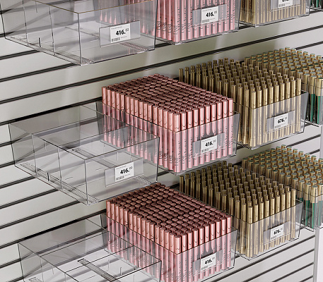Универсальный накопитель с регулируемыми разделителями идеально подходит для эстетичного размещения фасованных продуктов шириной до 180 мм: упаковок колготок, канцелярии, товаров для животных, косметики и т.п.