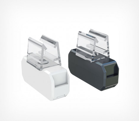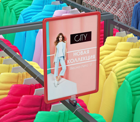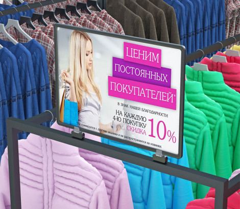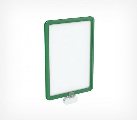 Захват рамки может поворачиваться на 90° по отношению к держателю, что позволяет менять расположение информационного носителя по отношению к поверхности размещения.