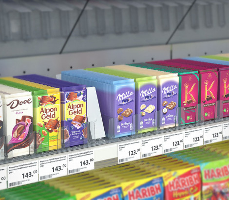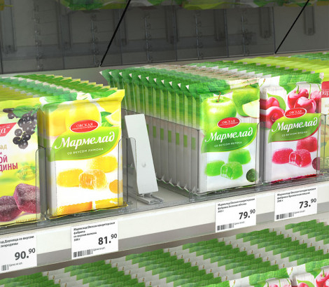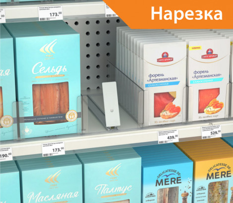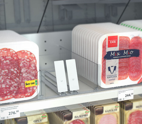 Толкатель FORTA GROSSA-0 — с наклонной толкающей поверхностью, без ограничителя, используется с товарами в высокой и твёрдой упаковке, с неустойчивым основанием, подходит для средних по весу и лёгких товаров: сырной, мясной и рыбной нарезок. При использовании с широкими упаковками рекомендуется установка двух толкателей для одного ряда продуктов
