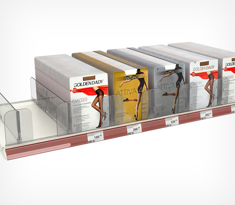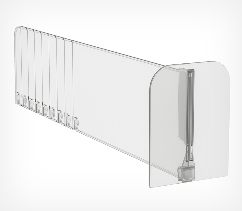 Уникальная модель разделителя с широким съемным передним ограничителем. Позволяет организовать выкладку на полке товаров средних и крупных размеров.