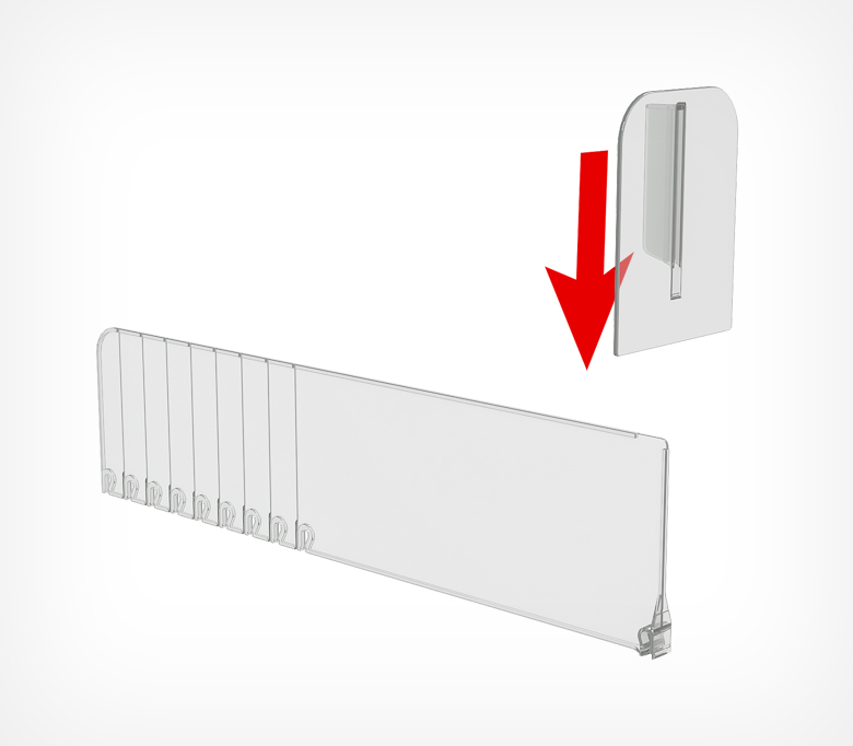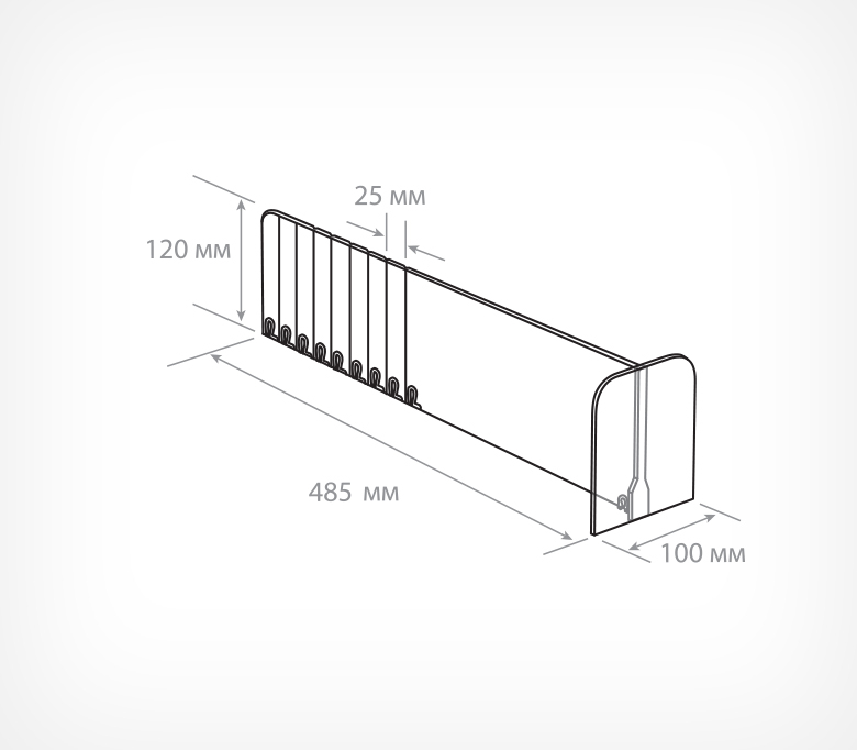 Разделитель DIV120-BTW120 выс.120 мм.широк.огран.120 мм 285-485мм — пластиковое изделие, которое используется для выкладки товаров средних и крупных размеров. Некоторые характеристики: высота переднего ограничителя: 80 мм; шаг обламывания: 25 мм; материал: прозрачный ударопрочный пластик тип крепления: замок на Т-профиль. Особенности: используется для упаковки, например, с нарезками сыров, колбасных и мясных изделий, пачками с крупами, сухими завтраками, детским питанием, колготками, передний ограничитель удерживает товар от падения с полки, насечки по длине позволяют уменьшать размер изделия для разной глубины полок.