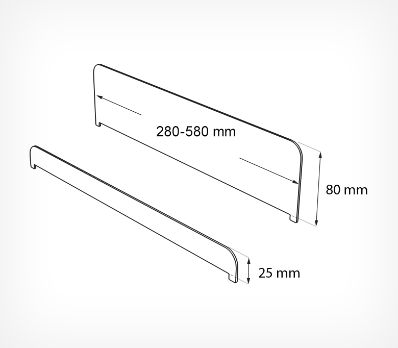 Необходим для разделения товаров на полке. Высота разделителя должна быть не менее 1/3 от высоты продукта. Если полка является крайней, то для предотвращения падения продуктов используется высокий разделитель с этого края.