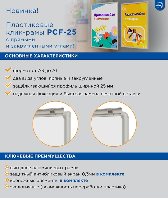 Пластиковая клик-рама с защелкивающимся профилем шириной 25 мм. Оптимальный выбор для размещения рекламной информации, информации о товарах, акциях, услугах, постеров. Материал задней стенки - оргалит. В комплект входит защитный антибликовый экран 0,3 мм.